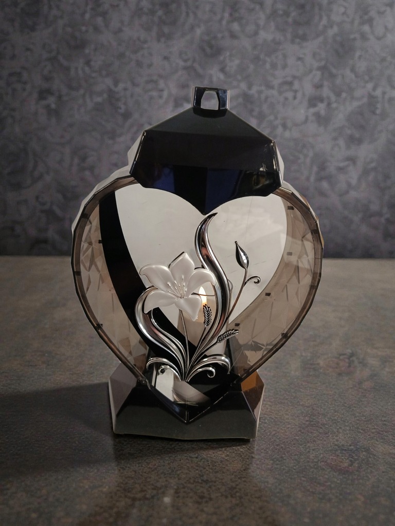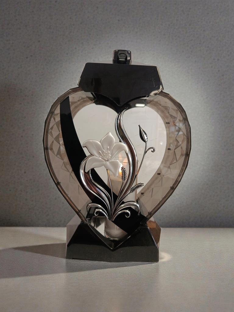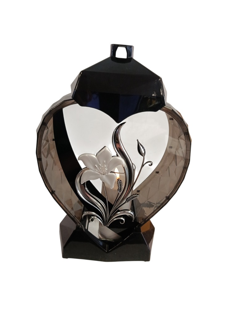 ELEGANCKI DUŻY ZNICZ SERCE LILIA SREBRNY ŚWIECA / WKŁAD LED W ZESTAWIE