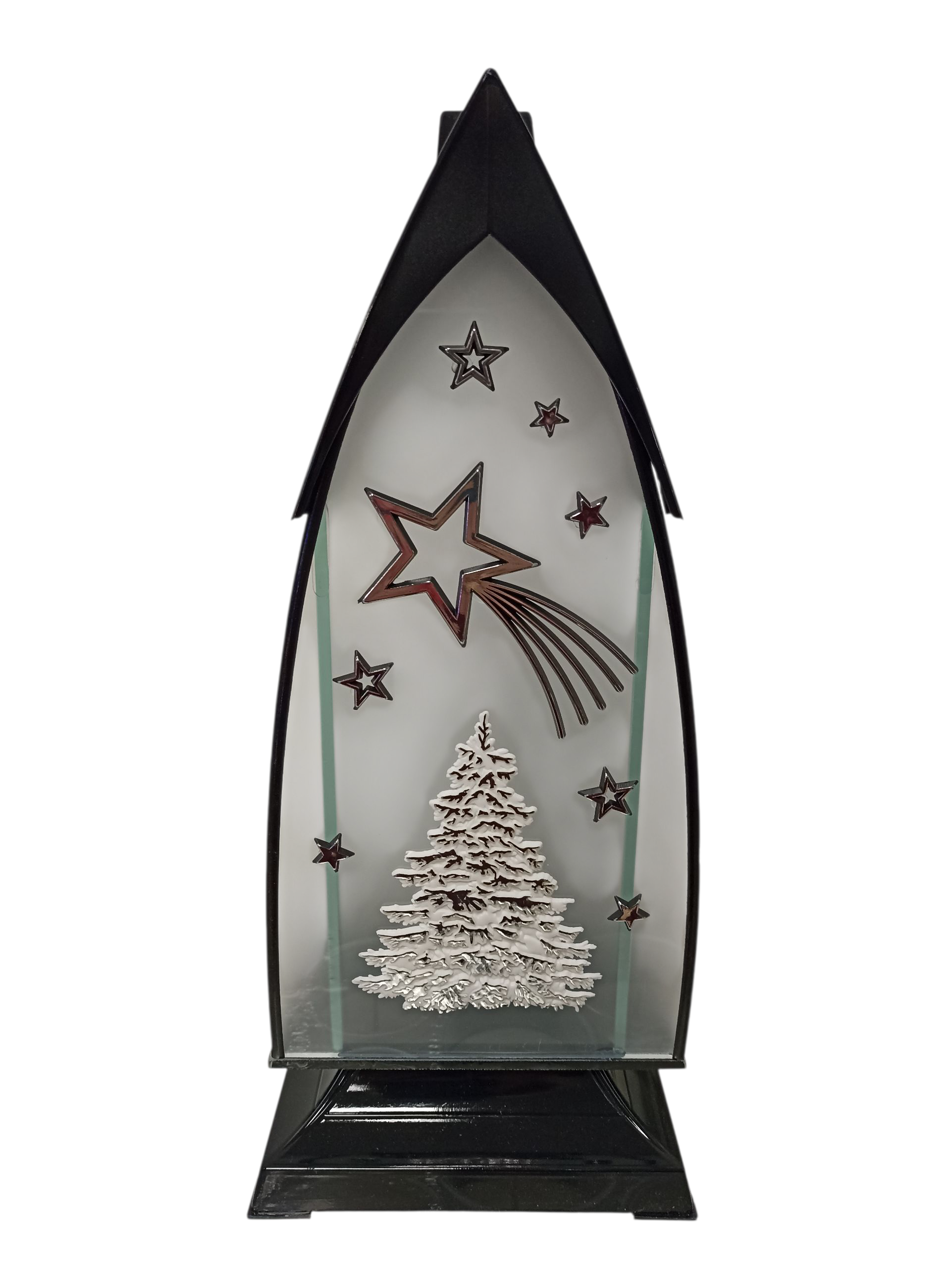 Znicz szklany, hartowany z przodu mleczne szkło. Ozdobiony srebrną choinką i gwiazdą betlejemską.