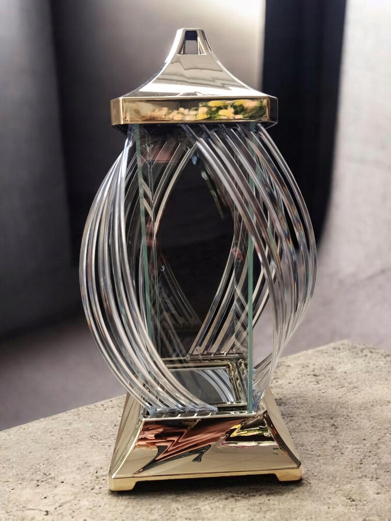 Duży znicz wstęga w kolorze złotym metalizowanym plus świeca ledowa. Elegancki i solidnie wykonany znicz o niepowtarzalnym wzorze.
