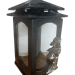 Solidny, ciężki znicz z żywicy w kolorze srebrnym, bardzo dobrej jakości. Odporny na warunki atmosferyczne. Ozdobiony motywem drzewa.